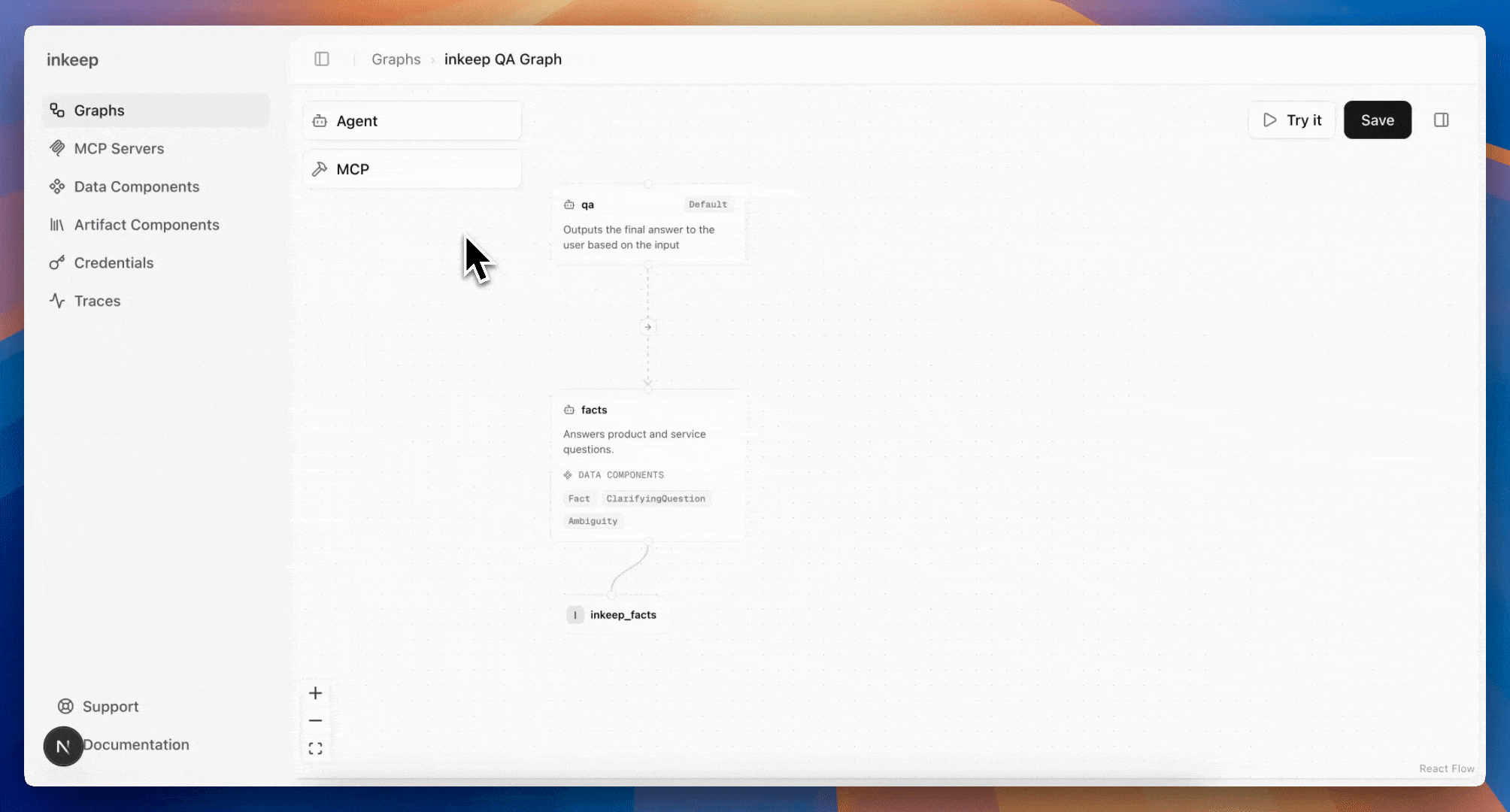 With Inkeep, you can create and manage Agents with a No-Code Visual Builder or a TypeScript Developer SDK. With full 2-way sync, both technical and non-technical teams can create and edit Agents collaboratively in either format.